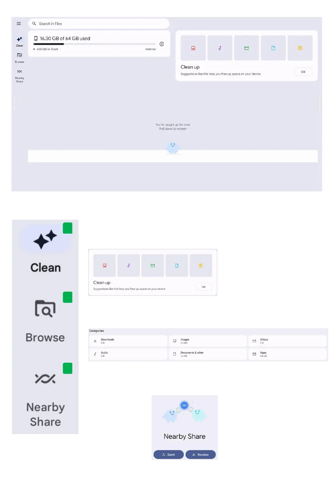 Google-based systems support internal file organization, file search, and Nearby Share file sharing.