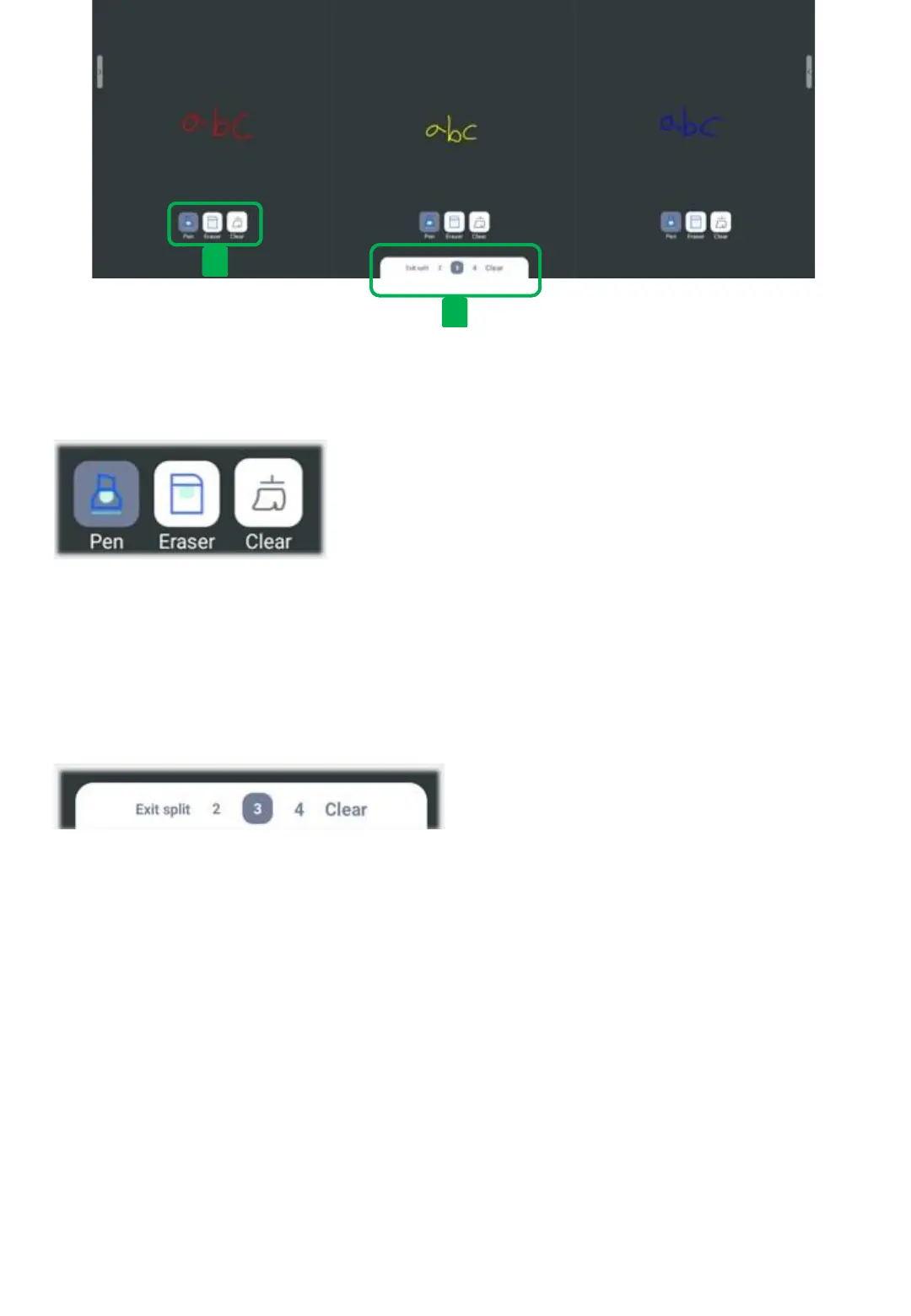 _ The Pen, Eraser, and Clear functions are available for each split screen.