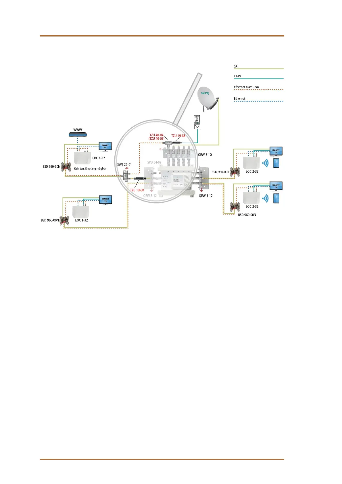 Die Signale werden am Teilnehmerausgang mit einer SAT-Weiche SWE 20-01 aufgeteilt. Ethernet over Coax