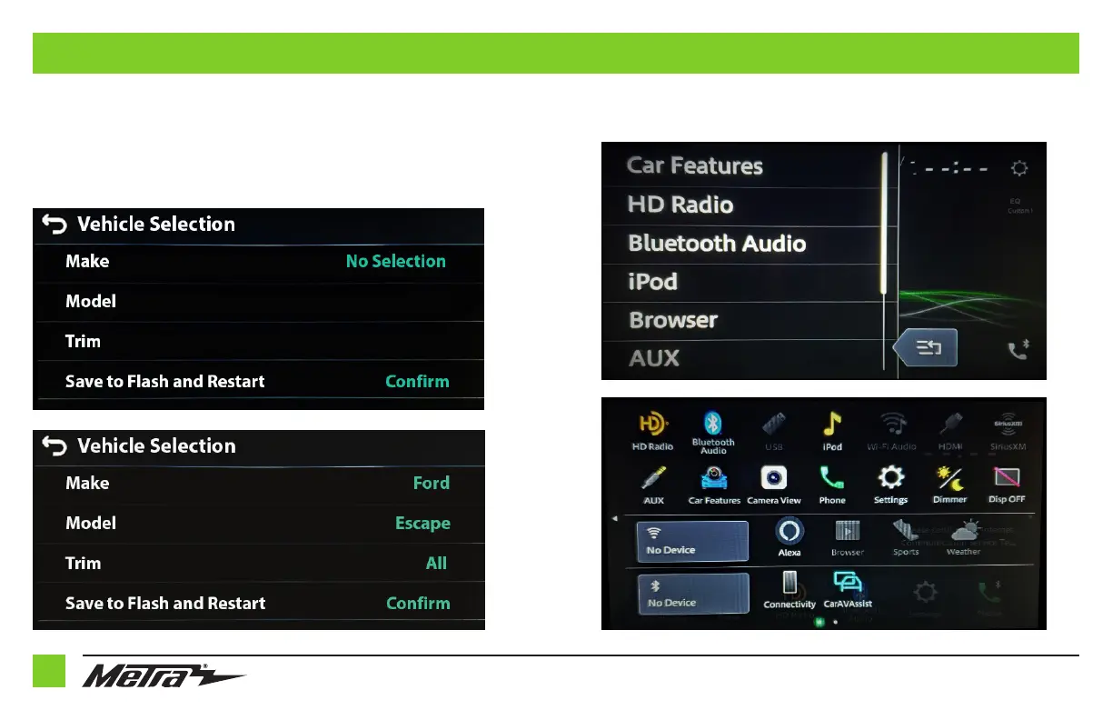 Selección del vehículo – Le permite seleccionar el vehículo en el que se está instalando el radio.