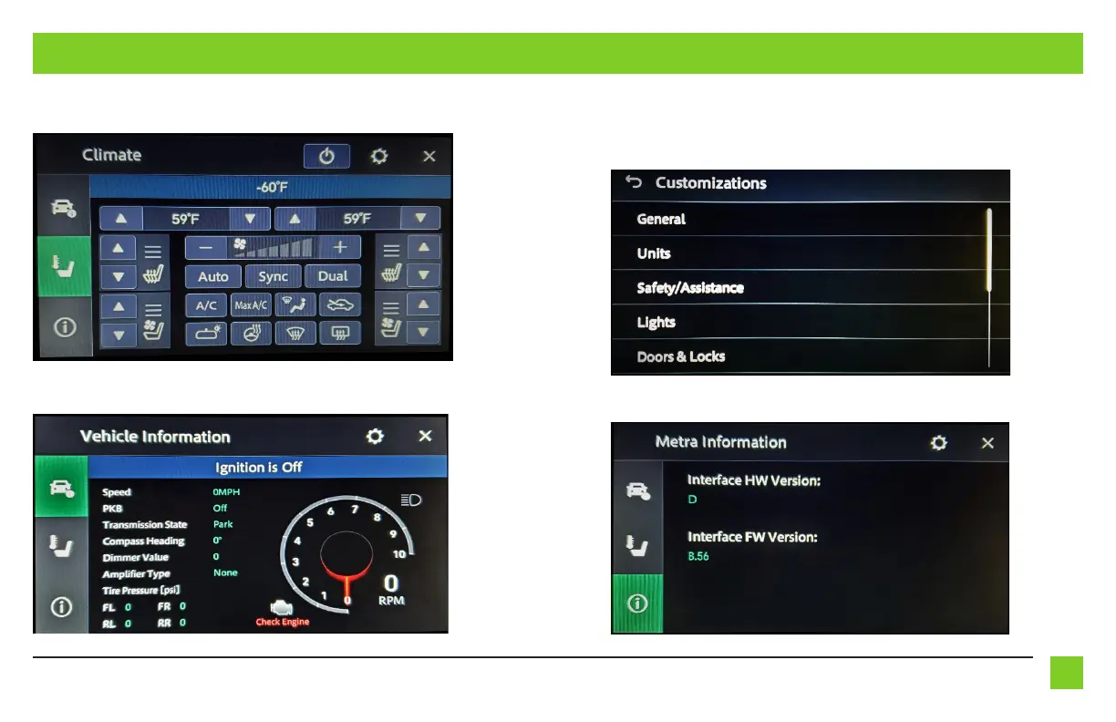 Operación de climatización (HVAC) - Pantalla de control y estatus de climatización (HVAC). Menú de personalizaciones - Permite controlar totalmente las opciones de personalización