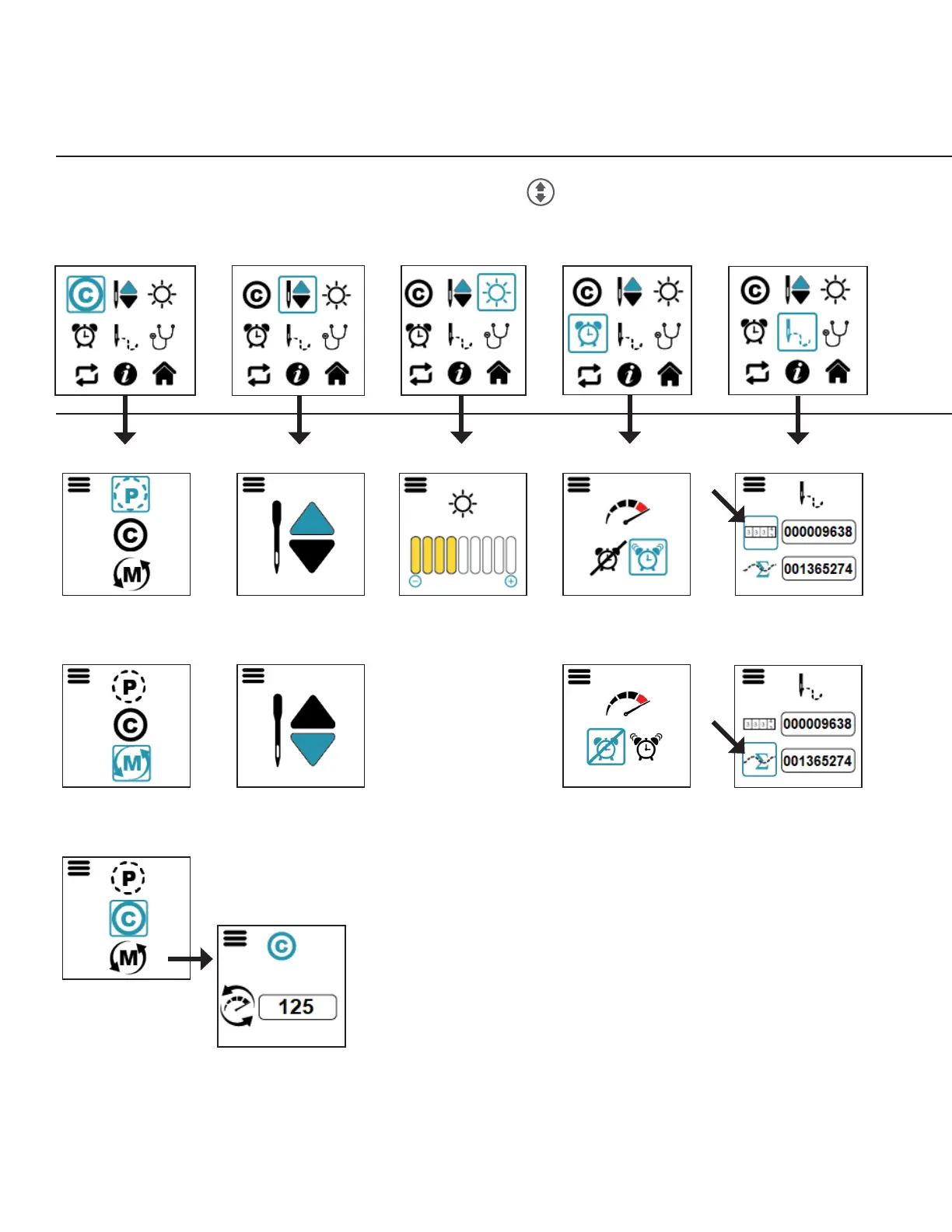 Menu Screens - Box around icon is the selected item. Press to go to sub-menu.