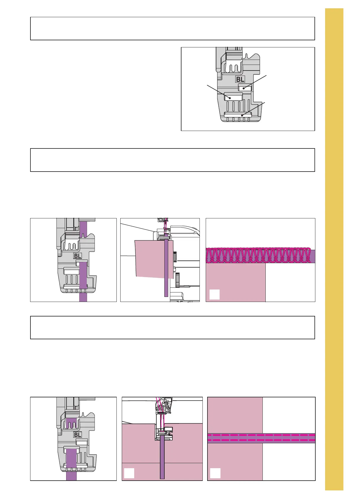 Insert the tape, ribbon or elastic into the slot and down under the foot to the needles. Place the