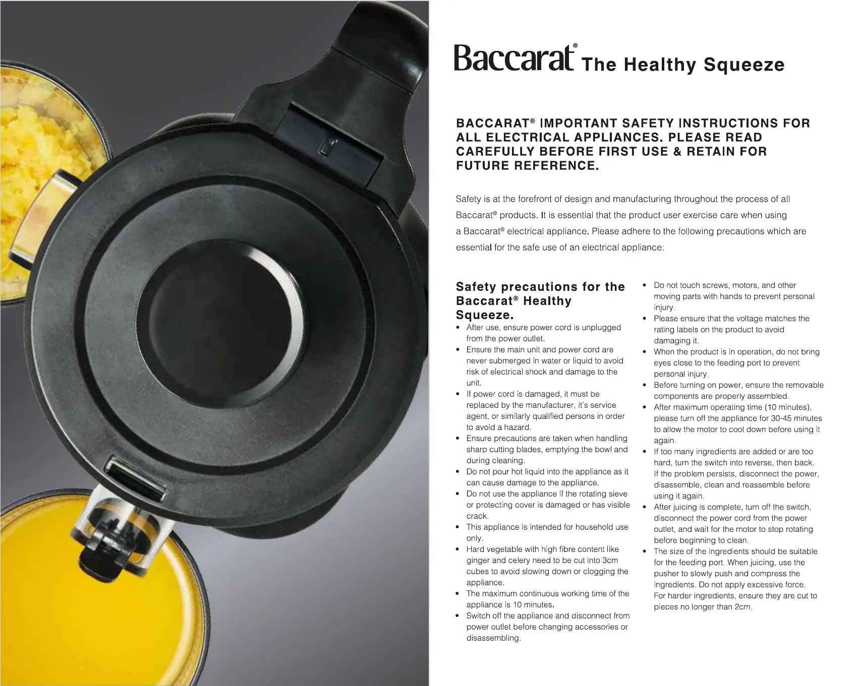 Bekijk gratis de handleiding van Baccarat The Healthy Squeeze, stel vragen en lees de antwoorden op veelvoorkomende problemen, of gebruik onze assistent om sneller informatie in de handleiding te vinden of uitleg te krijgen over specifieke functies.