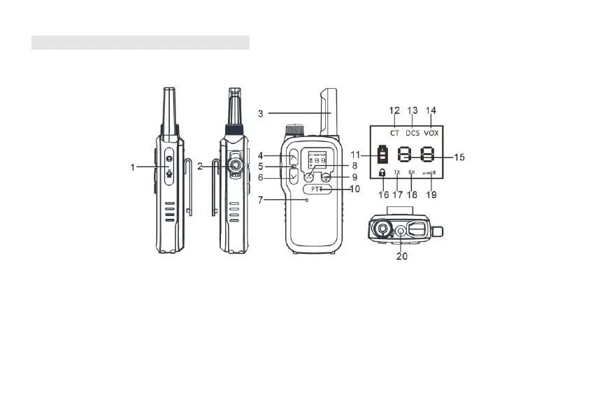 19. Indicateur de puissance d'émission 20. lampe de poche LED