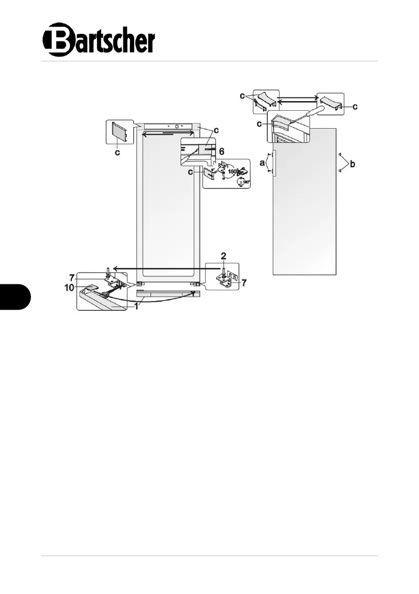 10. Insert the support (6) into cooler door and screw i it in openings at the other side