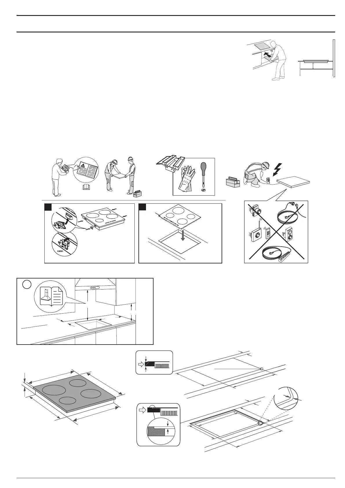 • Incassare il piano di cottura in un piano di lavoro avente uno spessore di almeno 20 mm.