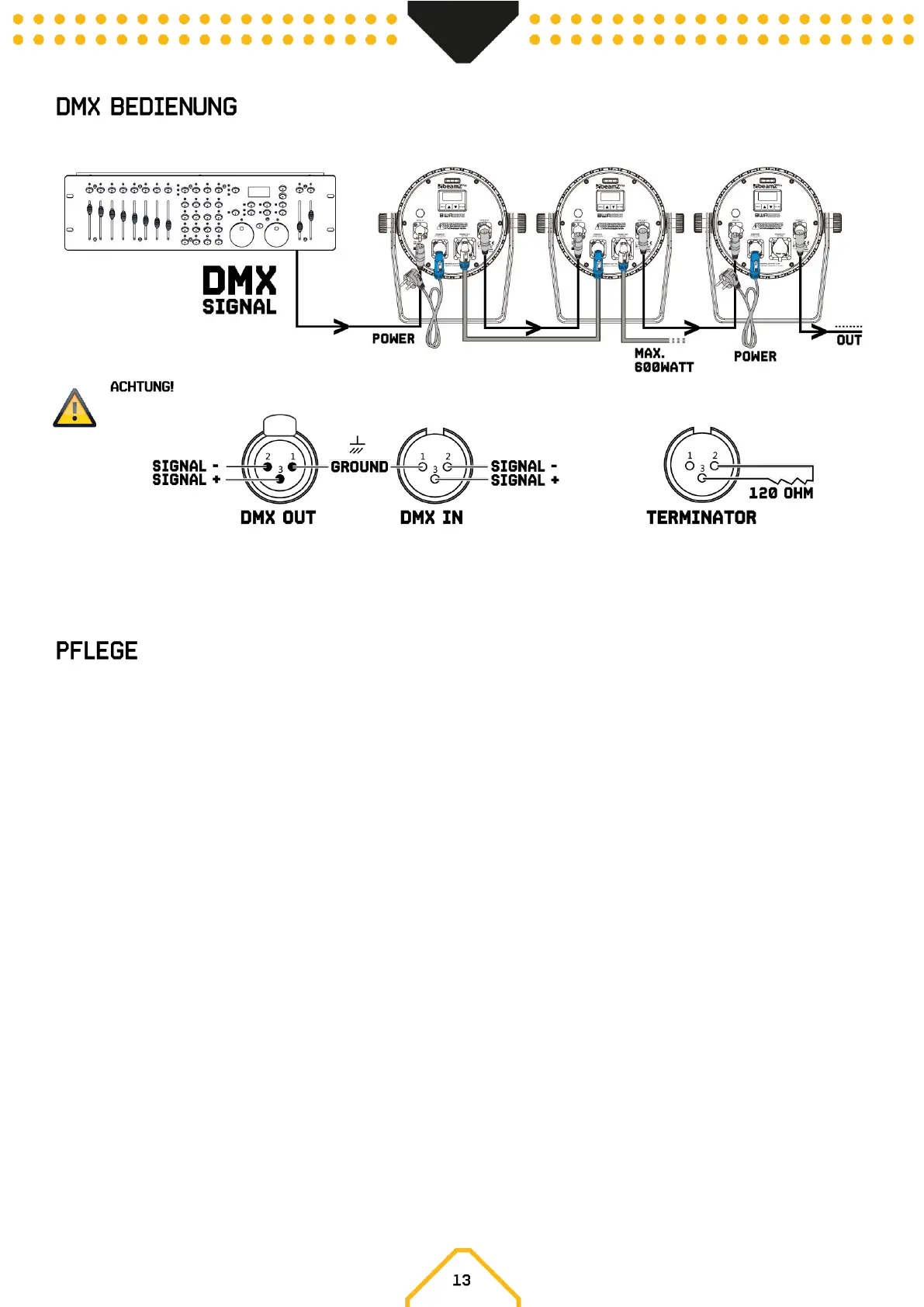 Sie einen 120-Ohm-Widerstand zwischen Signal (-) und Signal (+) und stecken Sie diesen in den DMX-Ausgang der letzten Gerät in der Leitung.