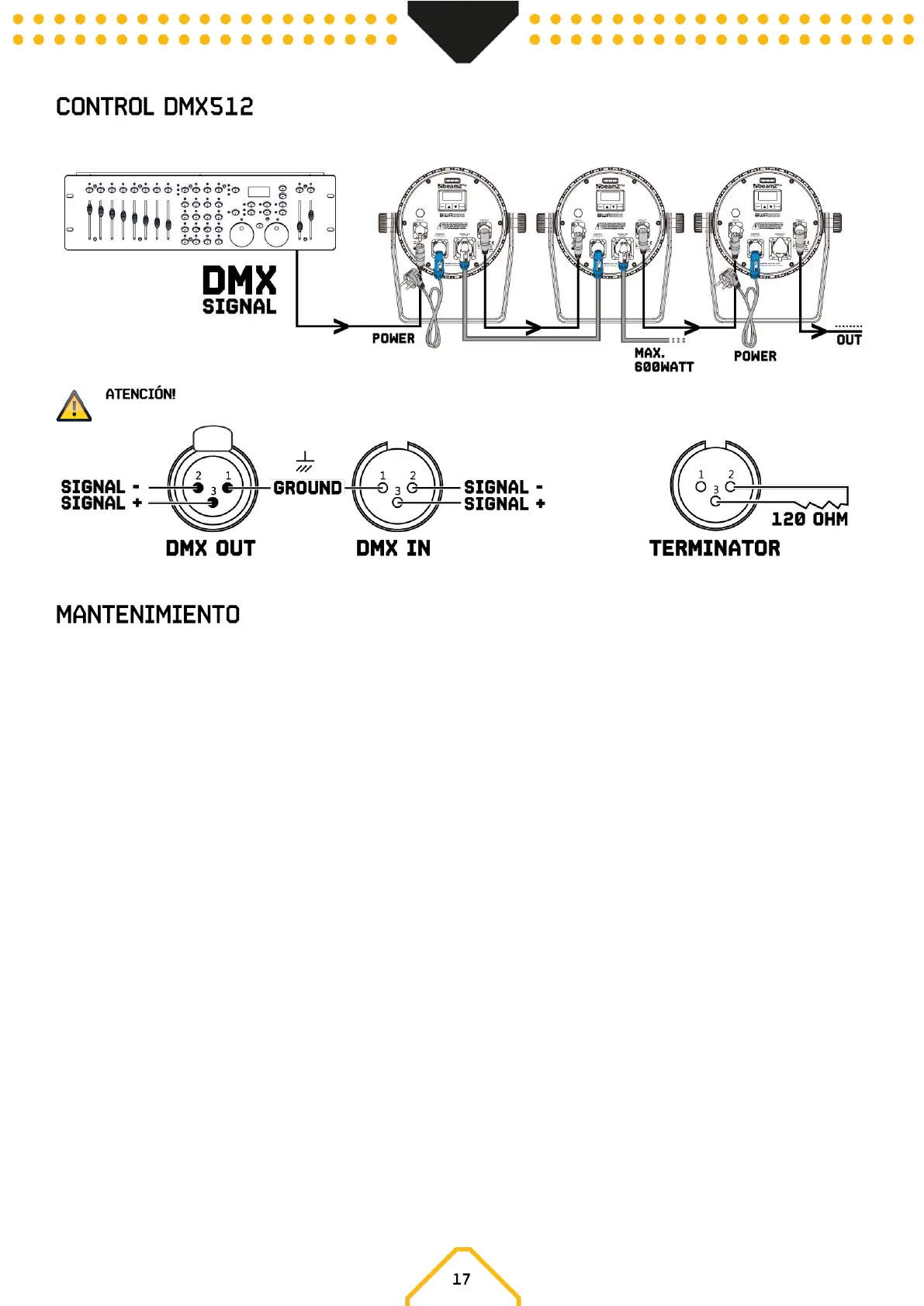 de 120 Ohm entre la señal (-) y la señal (+) y conéctela a la salida DMX del último dispositivo en la línea.