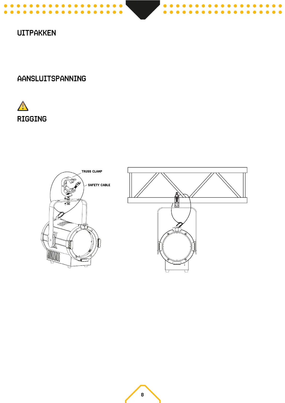 Volg bij het uitvoeren van een installatie altijd de Europese en nationale richtlijnen met betrekking tot rigging, truss en alle andere veiligheidskwesties.