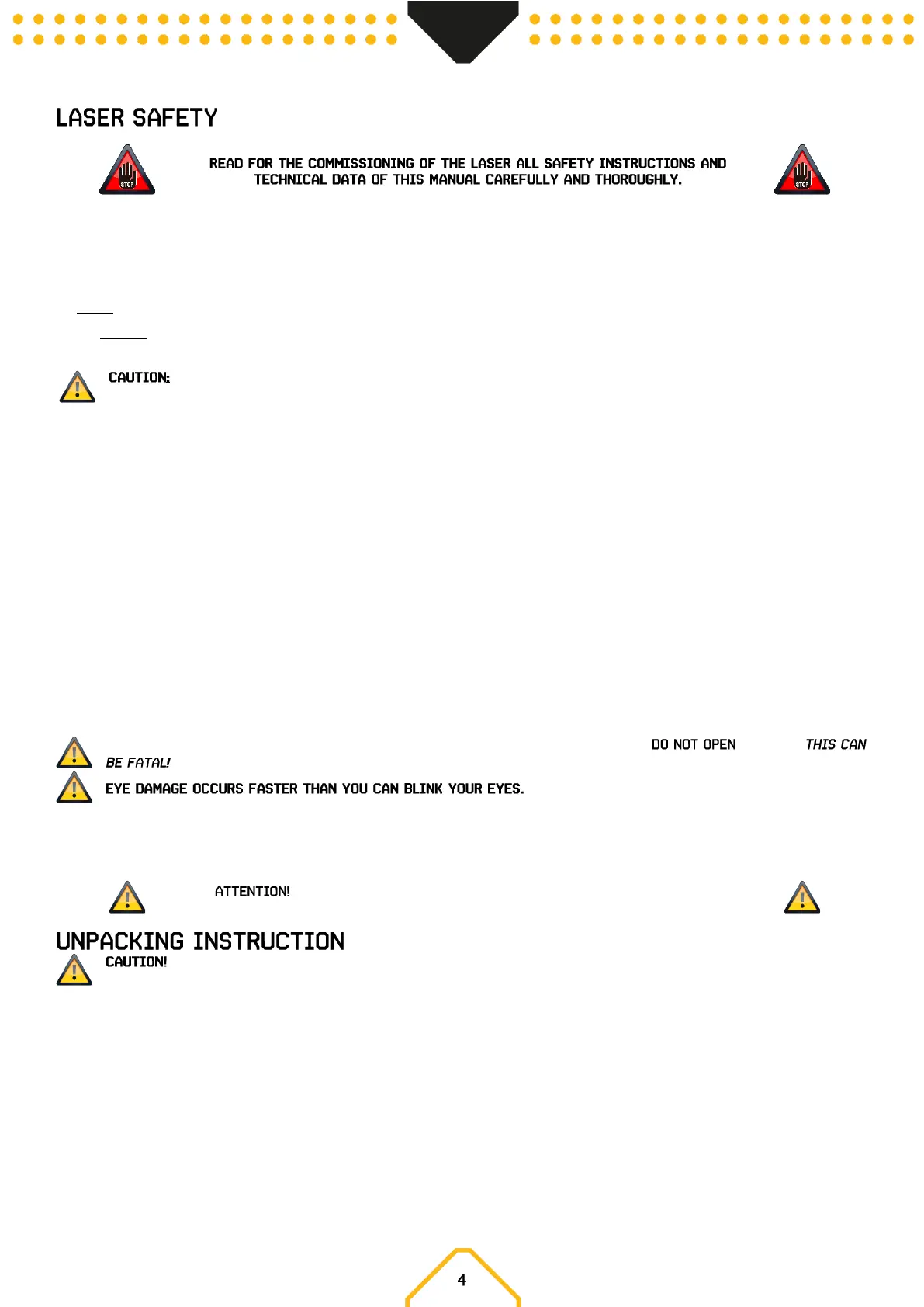 • The operation of a laser is only allowed if the show is controlled by a skilled and well-trained operator familiar with the requirements that
