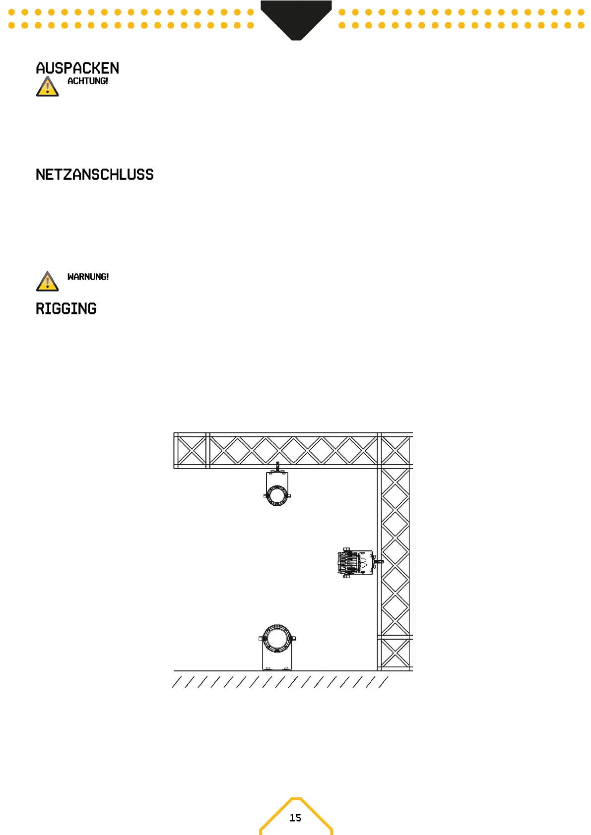 Befolgen Sie bei der Durchführung einer Installation immer die europäischen und nationalen Richtlinien bezüglich Rigging, Traversen und allen anderen