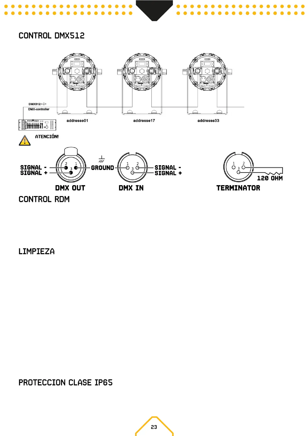 de 120 Ohm entre la señal (-) y la señal (+) y conéctela a la salida DMX del último dispositivo en la línea.