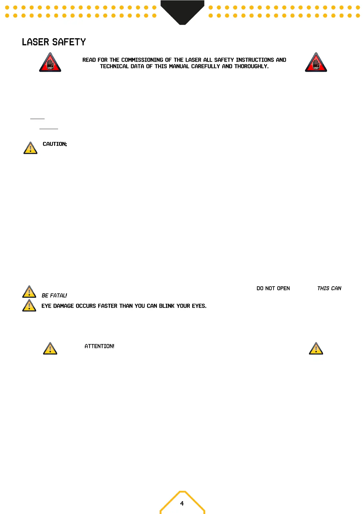 • The operation of a laser is only allowed if the show is controlled by a skilled and well-trained operator familiar with the requirements that