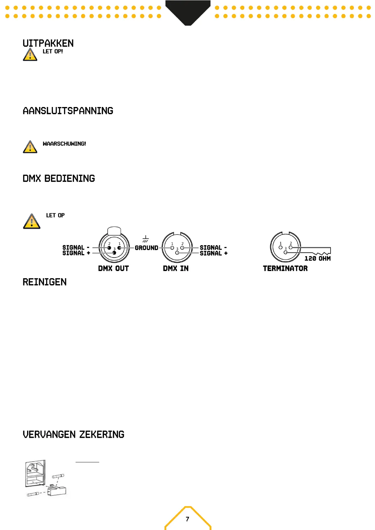 ! Bij het laatste apparaat, dient u de DMX-lijn af te sluiten met een eindweerstand. Neem een XLR connector en soldeer een 120 Ohm