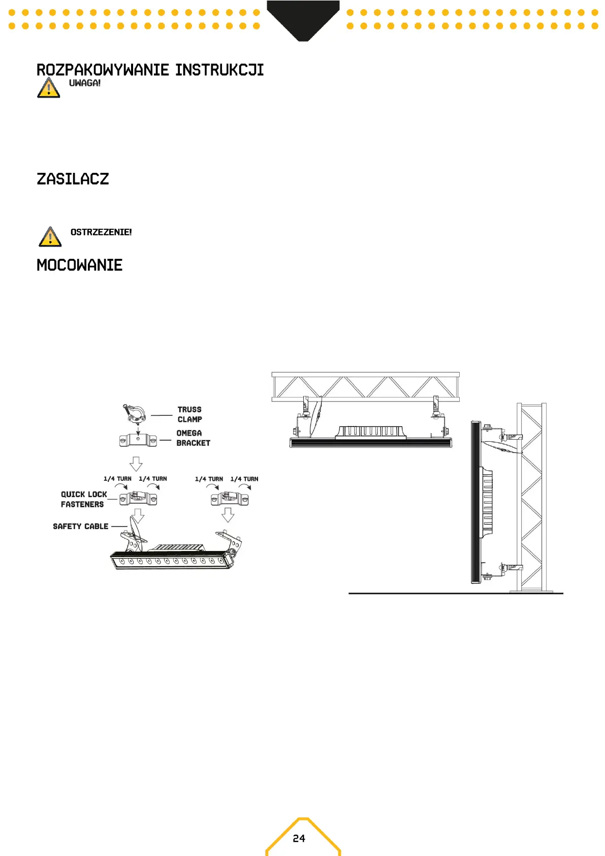 zamontować do góry nogami do kratownicy, patrz poniższy rysunek. Do zamocowania wymagane są certyfikowane zaciski o prawidłowym obciążeniu