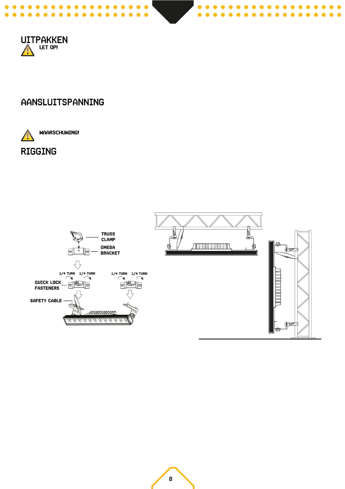 Volg bij het uitvoeren van een installatie altijd de Europese en nationale richtlijnen met betrekking tot rigging, truss en alle andere veiligheidskwesties.
