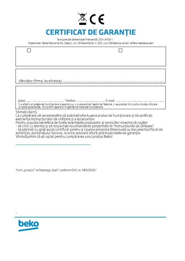 Service-ul acestui produs este asigurat de Beko Romania SA, cu sediul în Găeşti,