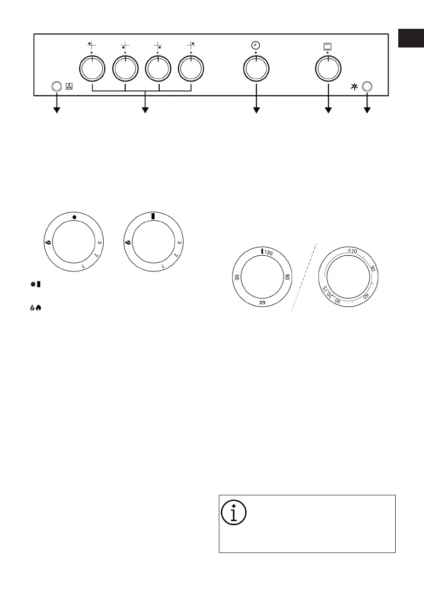 1 Lamp/Rotisserie button 2 Hob control knobs