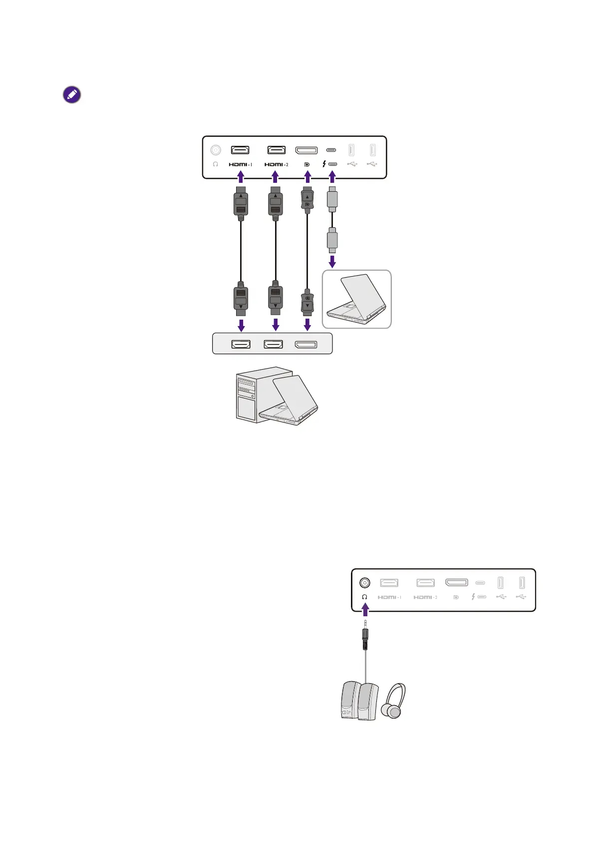 • Connect the plug of the HDMI cable to the HDMI port on the monitor. Connect the other end of