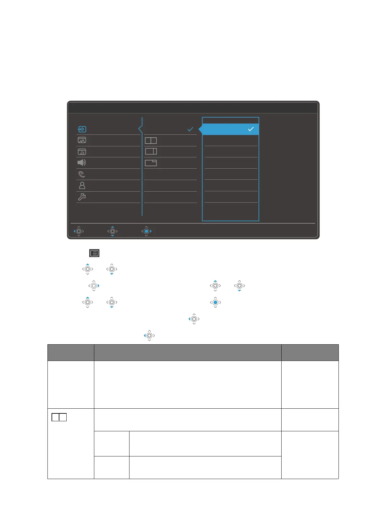 Available menu options may vary depending on the input sources, functions and settings. Menu