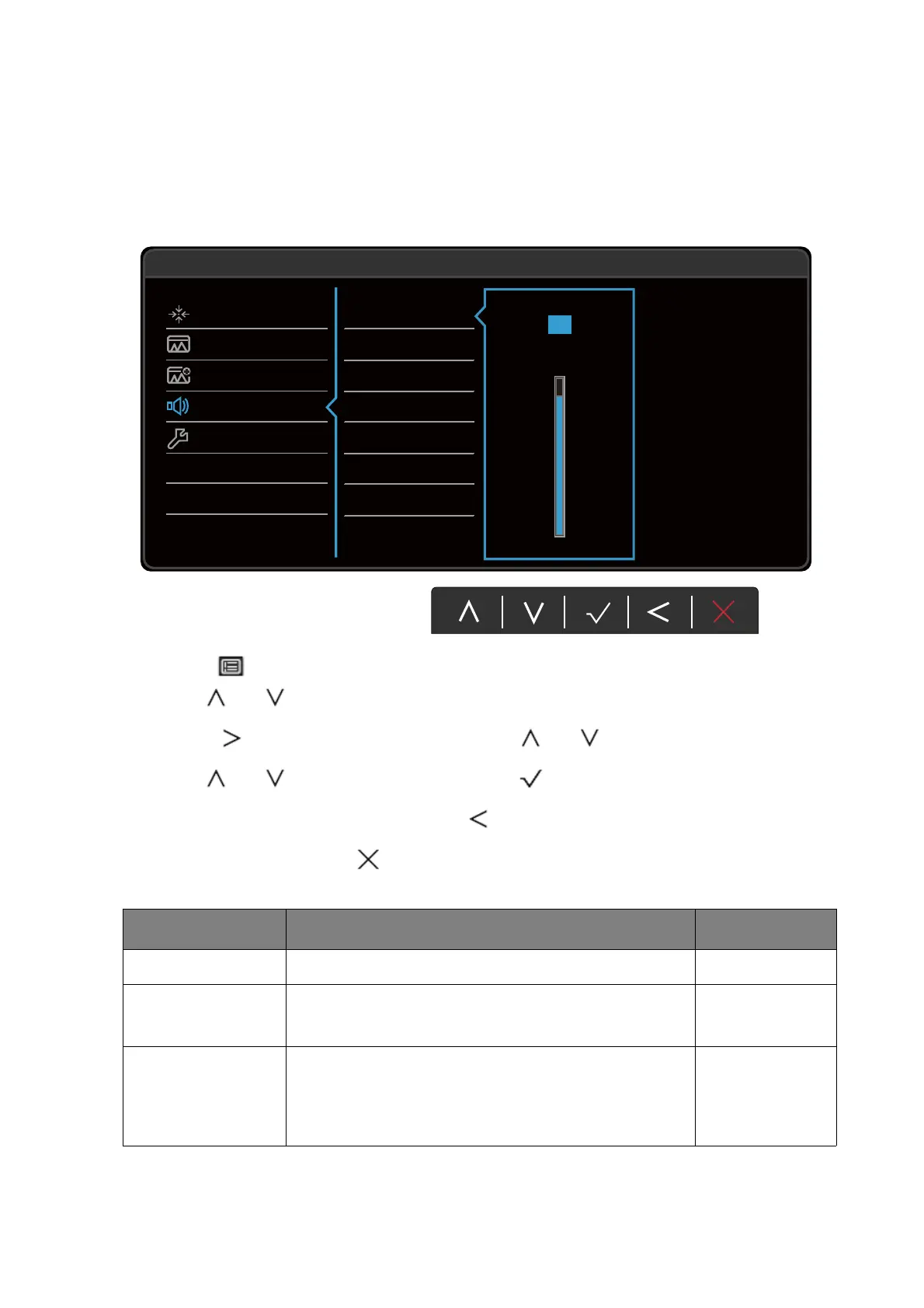 Volume Adjusts the audio volume. 0 ~ 100