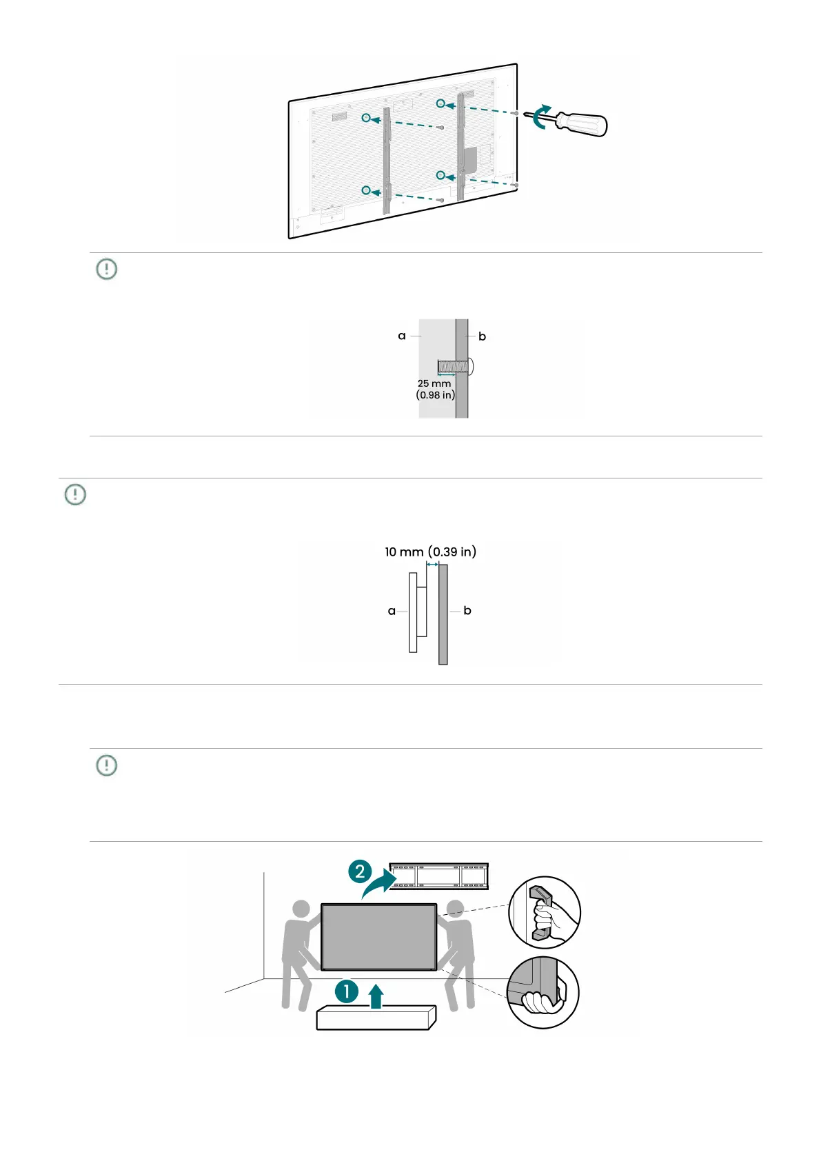 4. Align the bracket hooks with the plate, and then carefully mount the display onto the wall.