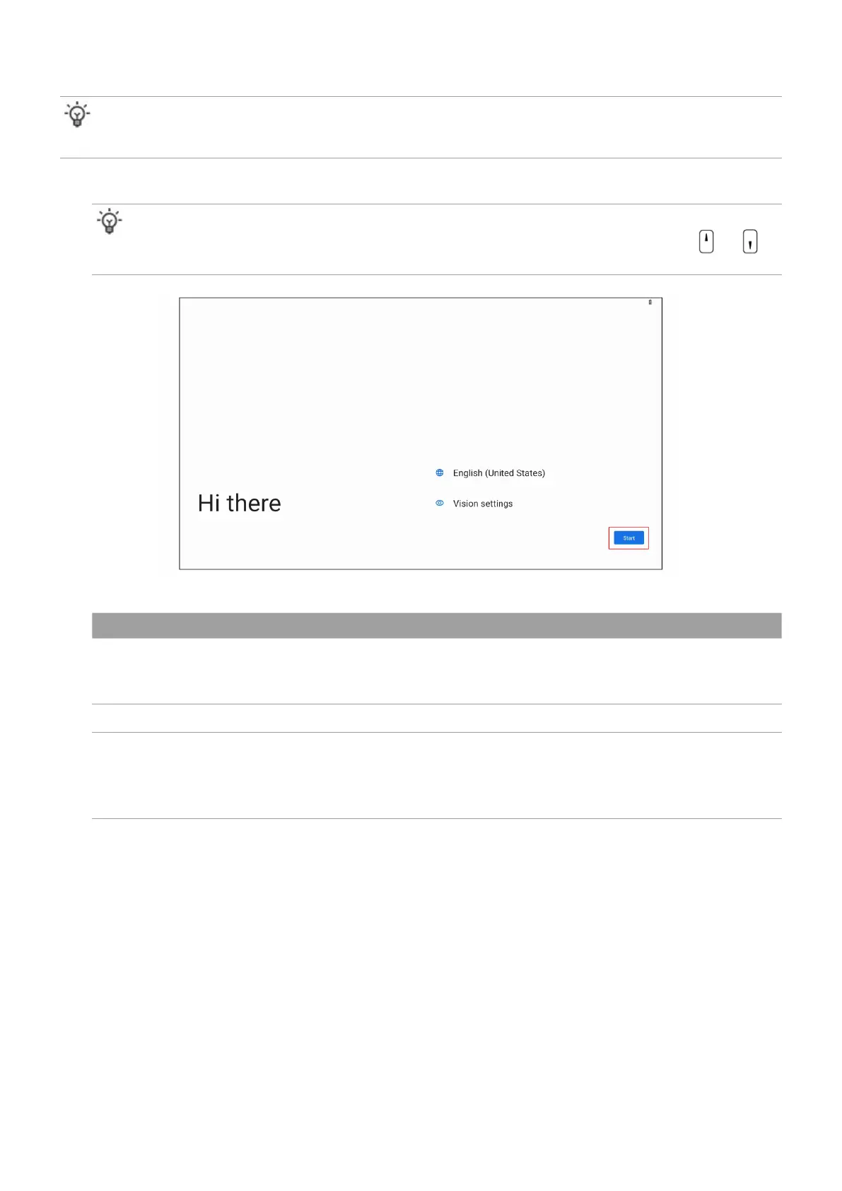 2. Set the language and vision settings, and then select Start.