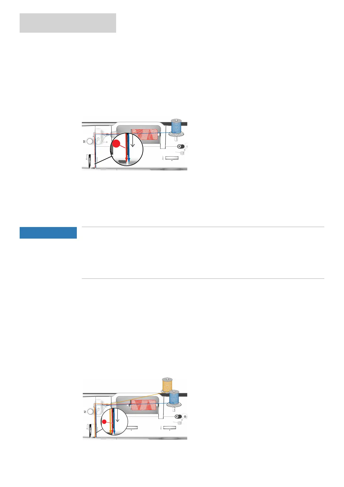 > Guide the thread from the vertical spool pin (blue) in the direction of the arrow to the right side of the