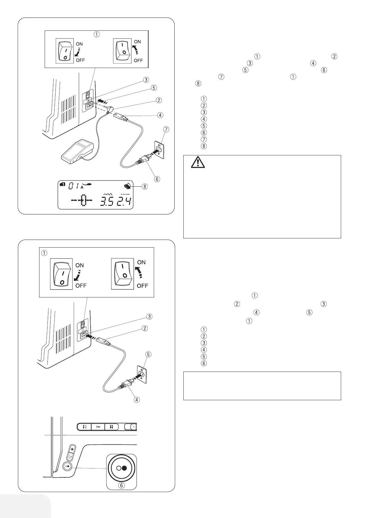 Switch off the power switch . Insert the foot control plug
