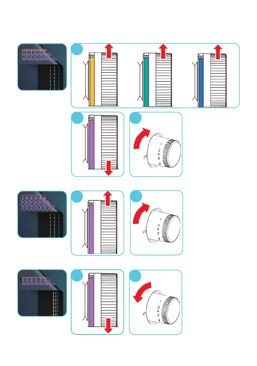 Needle thread (yellow, green or blue) creates loops on bottom side of the fabric.