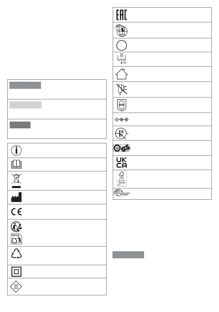 Det brukes følgende symboler på selve enheten, i bruksanvisningen,
