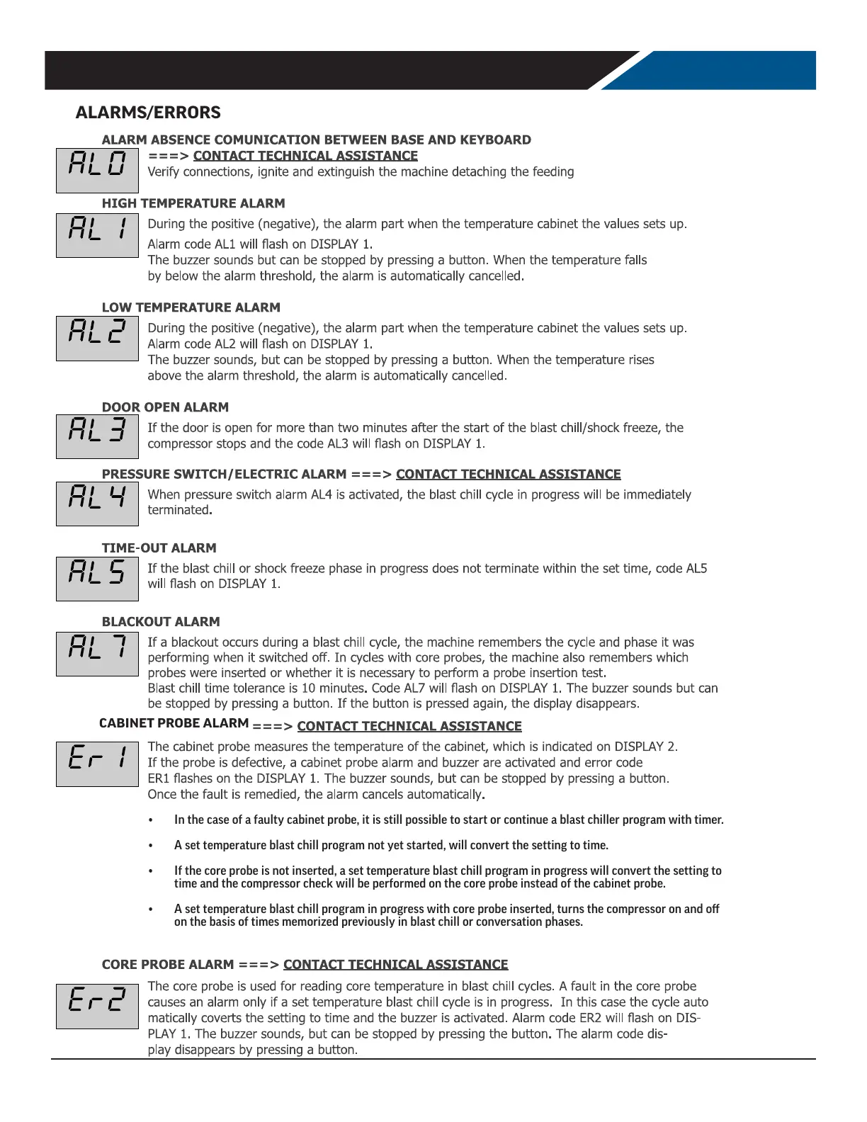 • In the case of a faulty cabinet probe, it is still possible to start or continue a blast chiller program with timer.