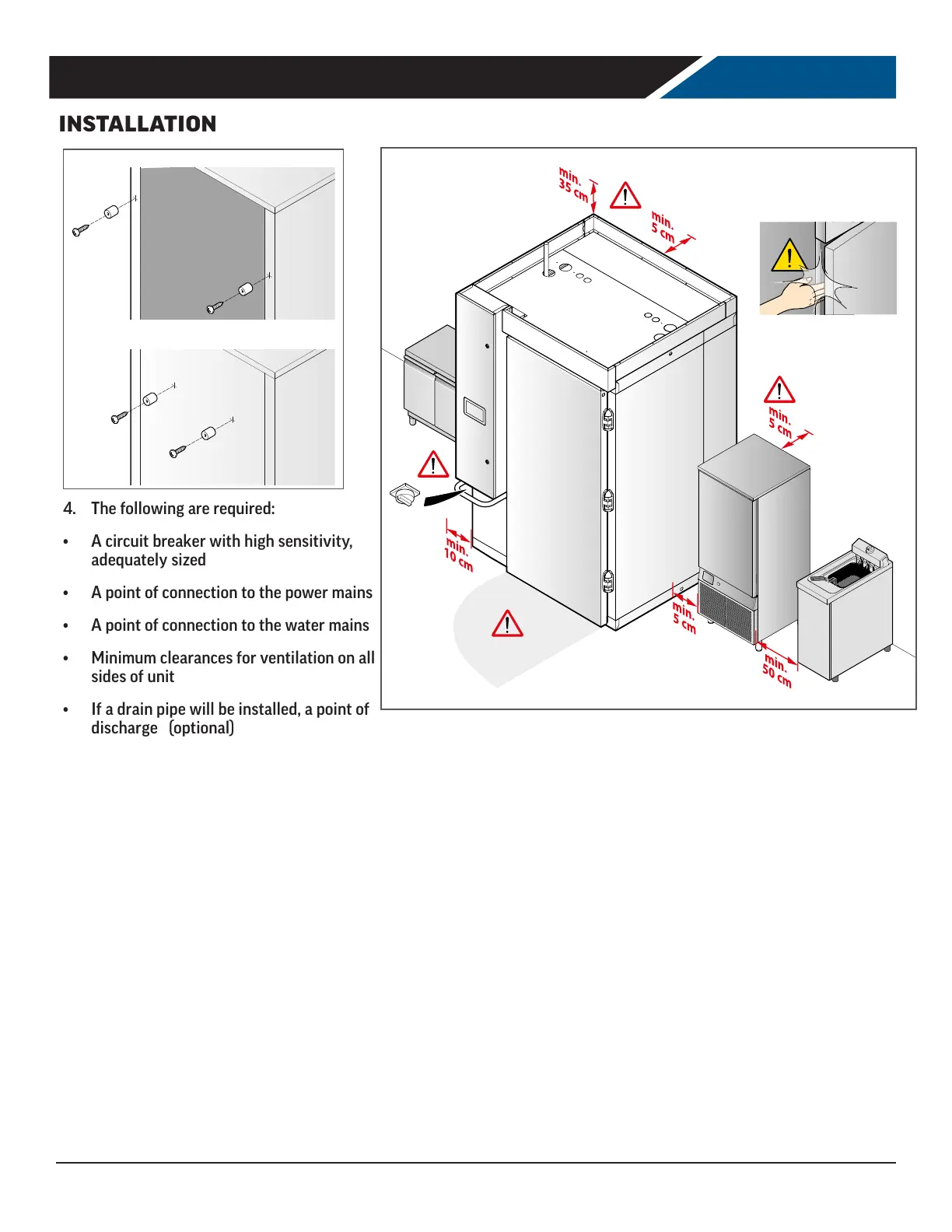 6. Keep the illustrated minimum clearances around the device. This will facilitate connections to utilities and maintenance.
