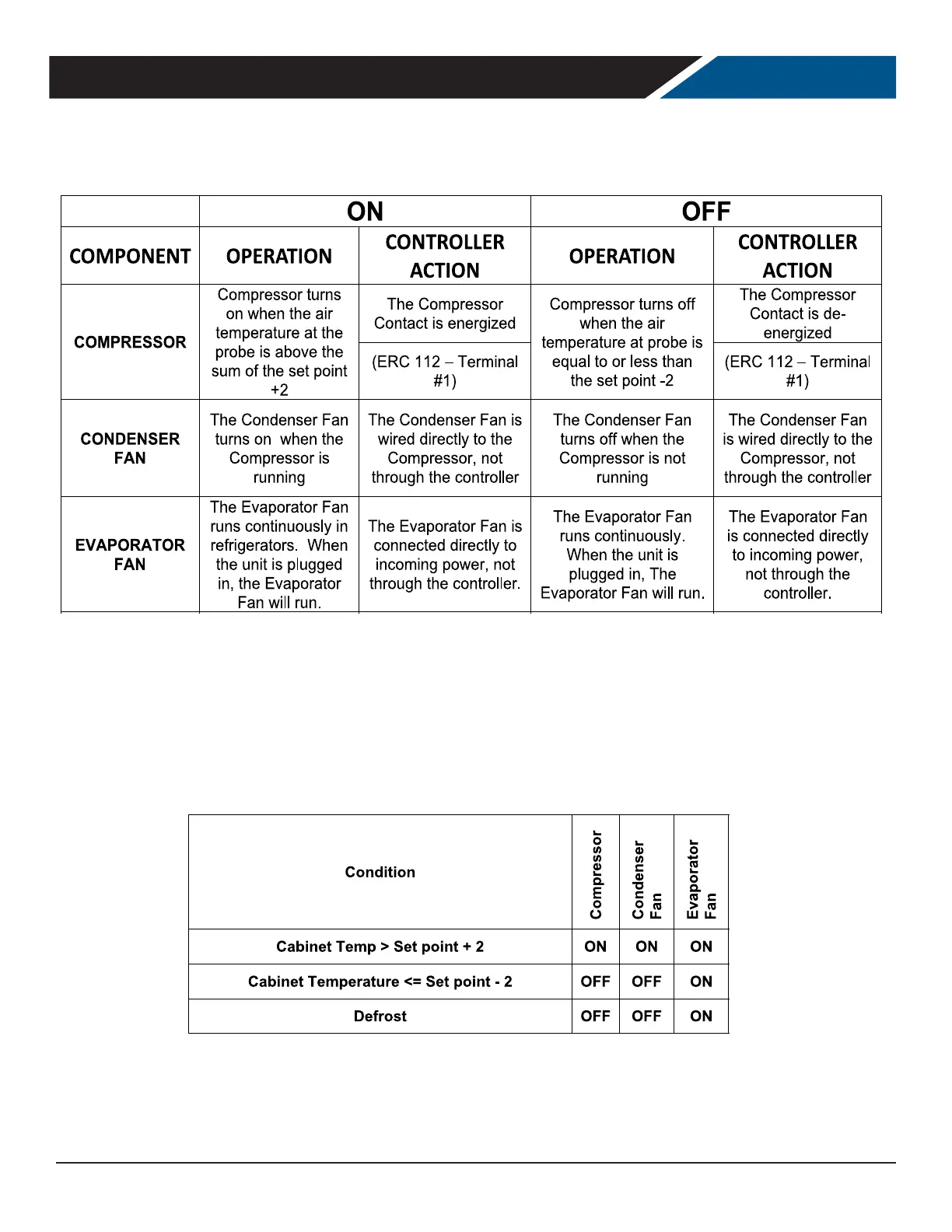 Cabinet Temperature <= Set point - 2 OFF OFF ON ON or OFF