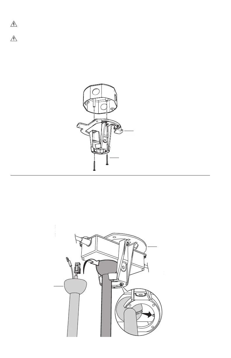 Eleve el ventilador hasta el soporte de montaje. Alinee la pestaña del soporte de