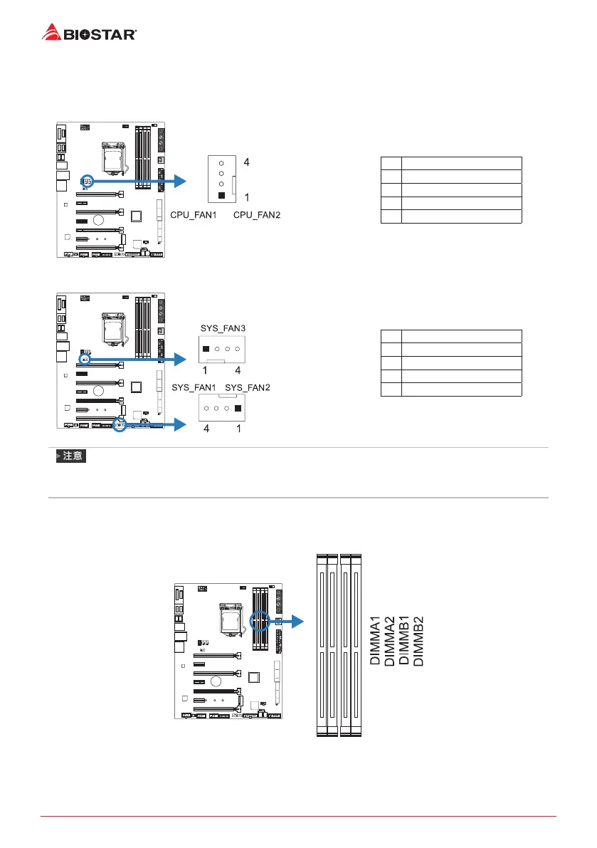 CPU_FAN1/2,SYS_FAN1/2/3支持4针脚和3针脚接口;接线时请注意红线是正极需接到第二