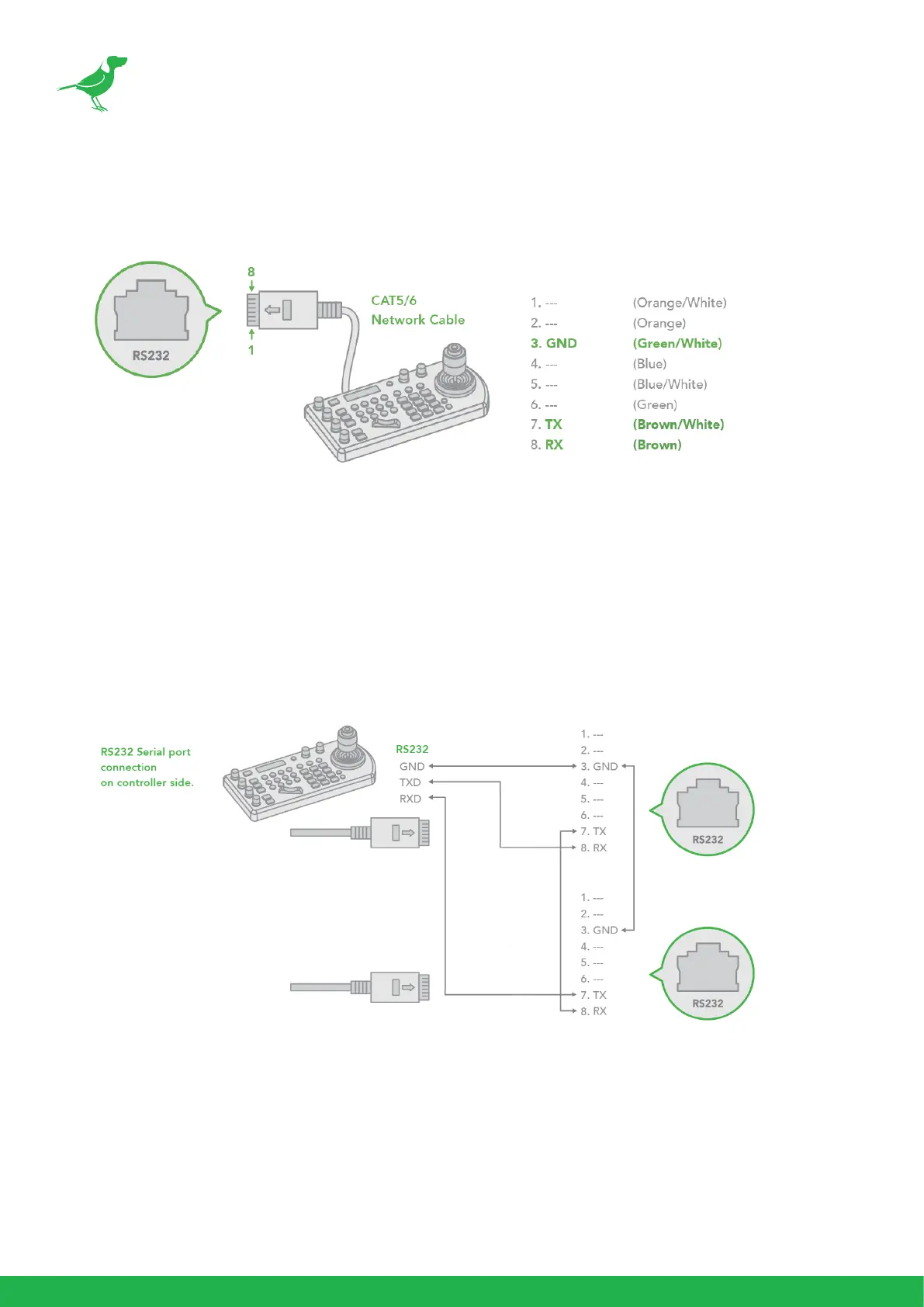 6. Or you can use CAT5/6 cable (T-568B standard pinout) to make an RS232 connection by following the pin
