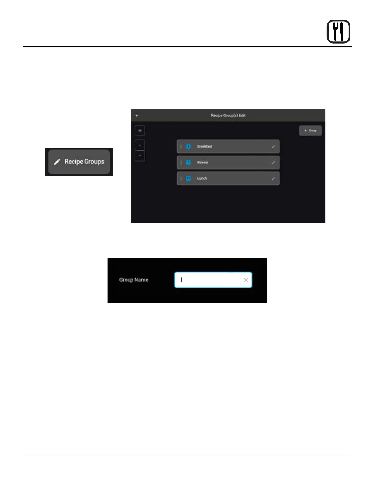 recipe editing menu. A listing of any current groups will be presented, select the + Group key in