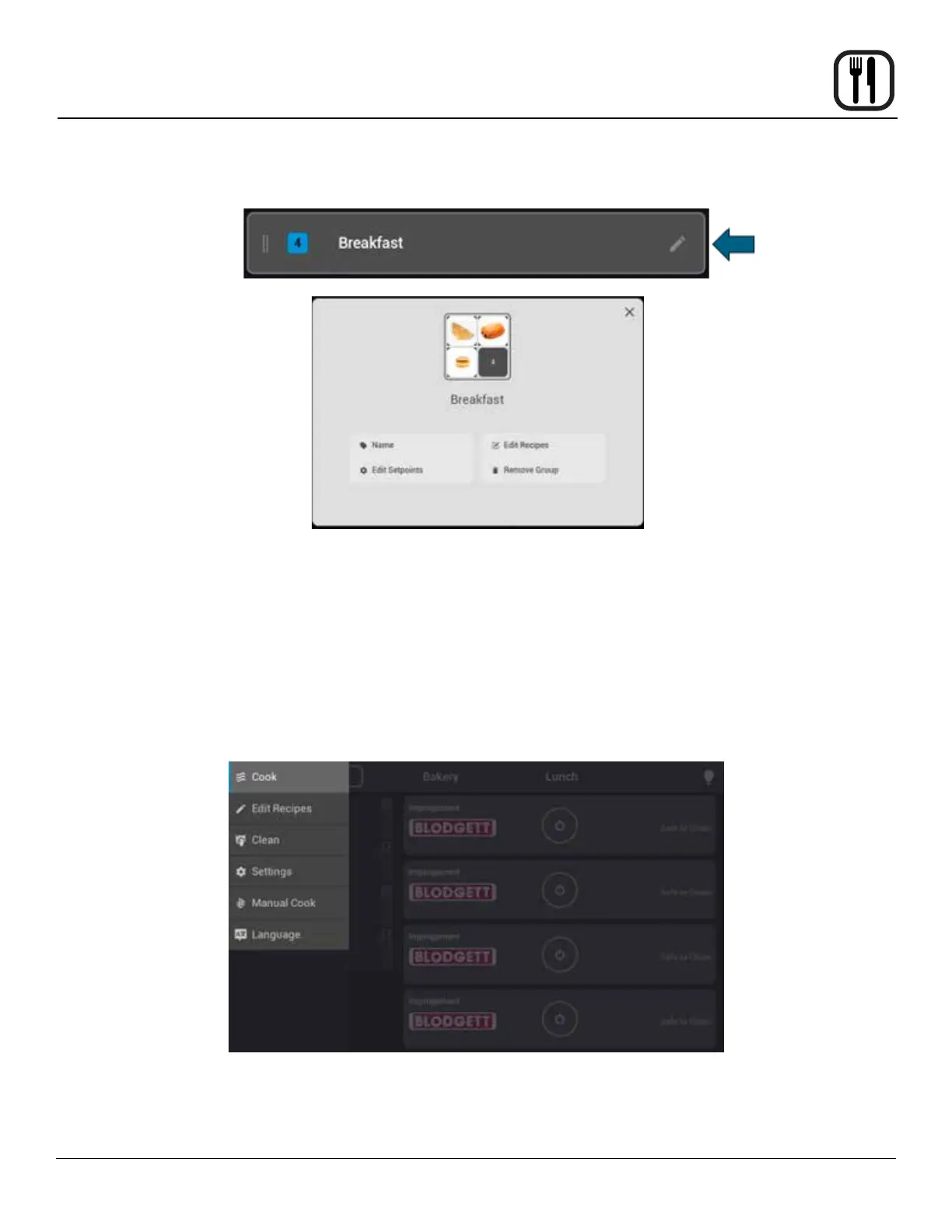 of any group title to edit that group (Name, Setpoints, Recipes, or Removal).