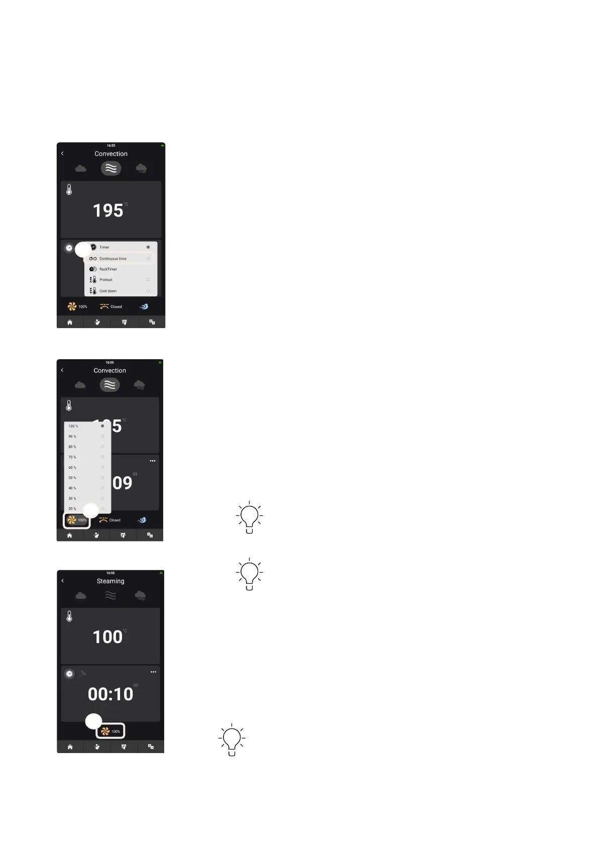 The fan has nine speeds from 20-100%. If the oven temperature is above 200°C,