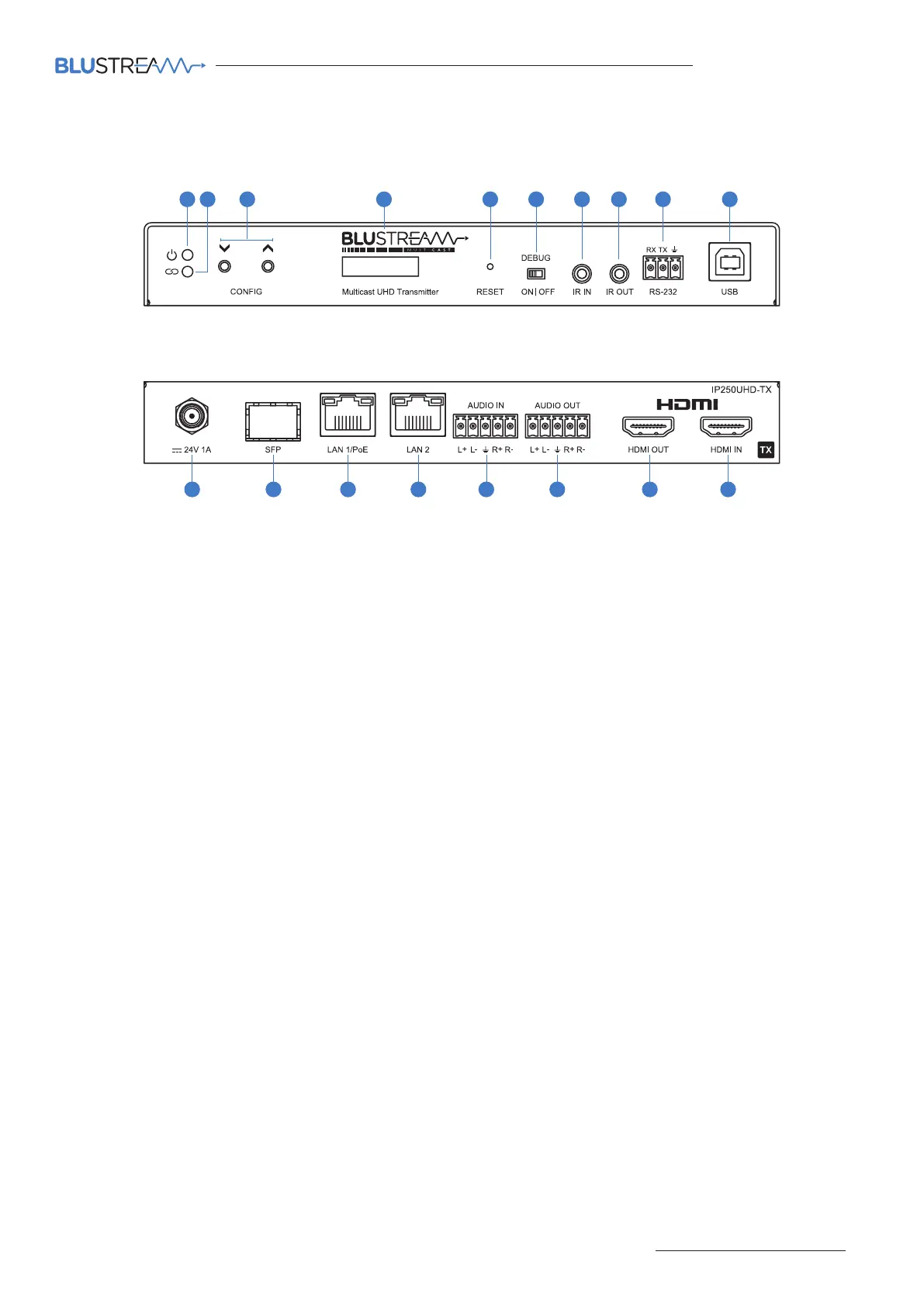 7 IR IN (IR input) – 3.5mm stereo jack. Transmits IR to any IP250UHD-RX receiver currently viewing the IP250UHD-TX,