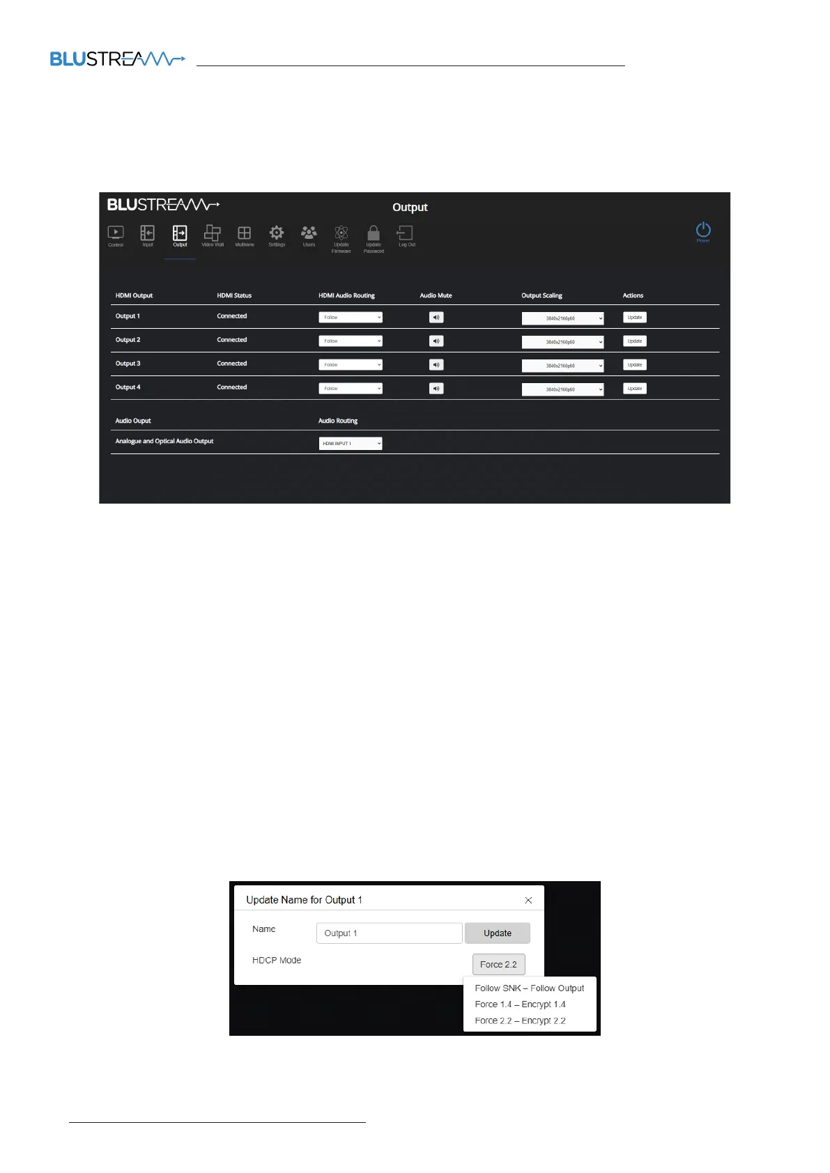 – If in Video Wall or Multiview mode, the output scaling will be disabled and can be set in their respective pages