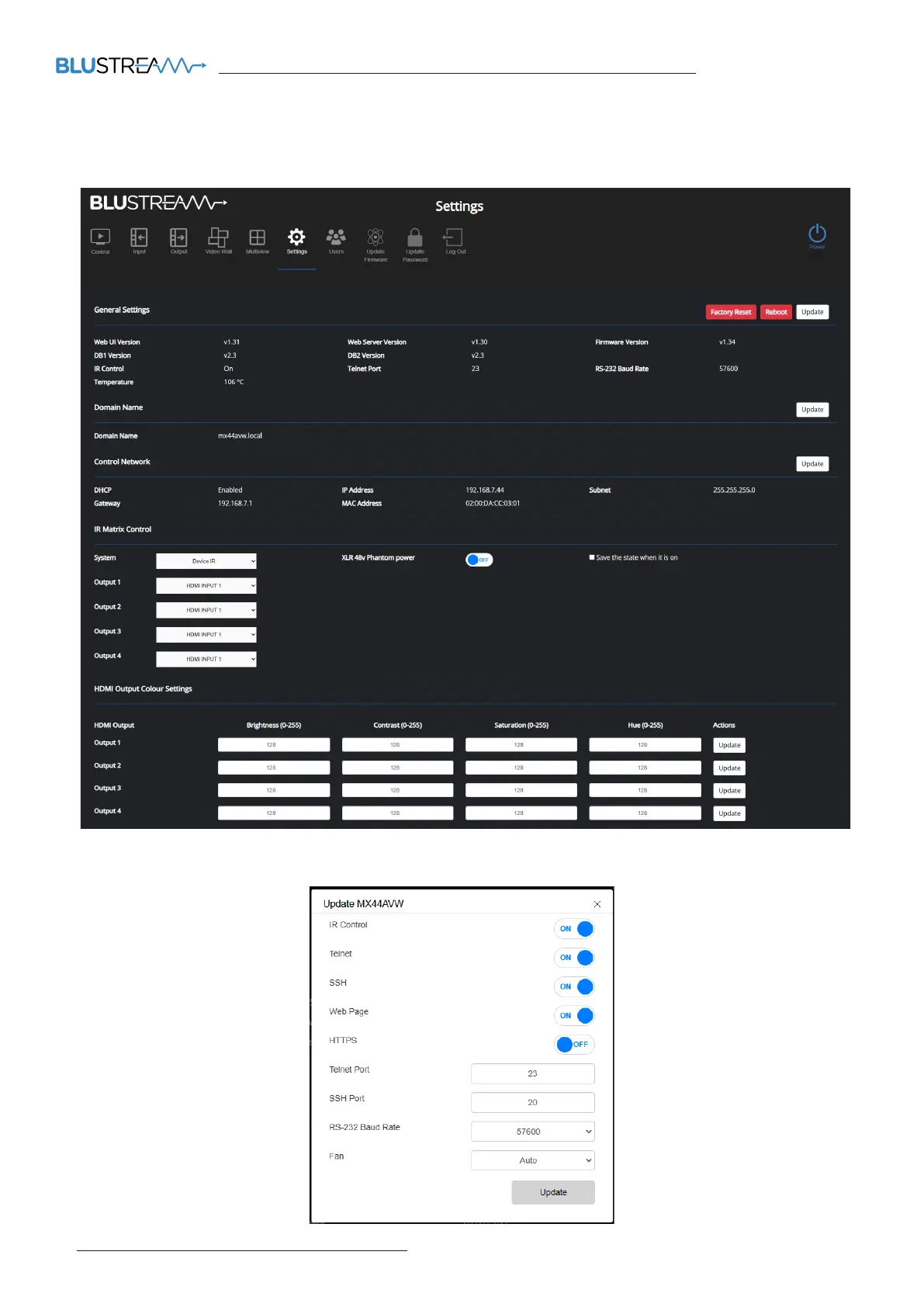 The Settings page allows for configuration of various functions of the MX44AVW, and provides information such as firmware