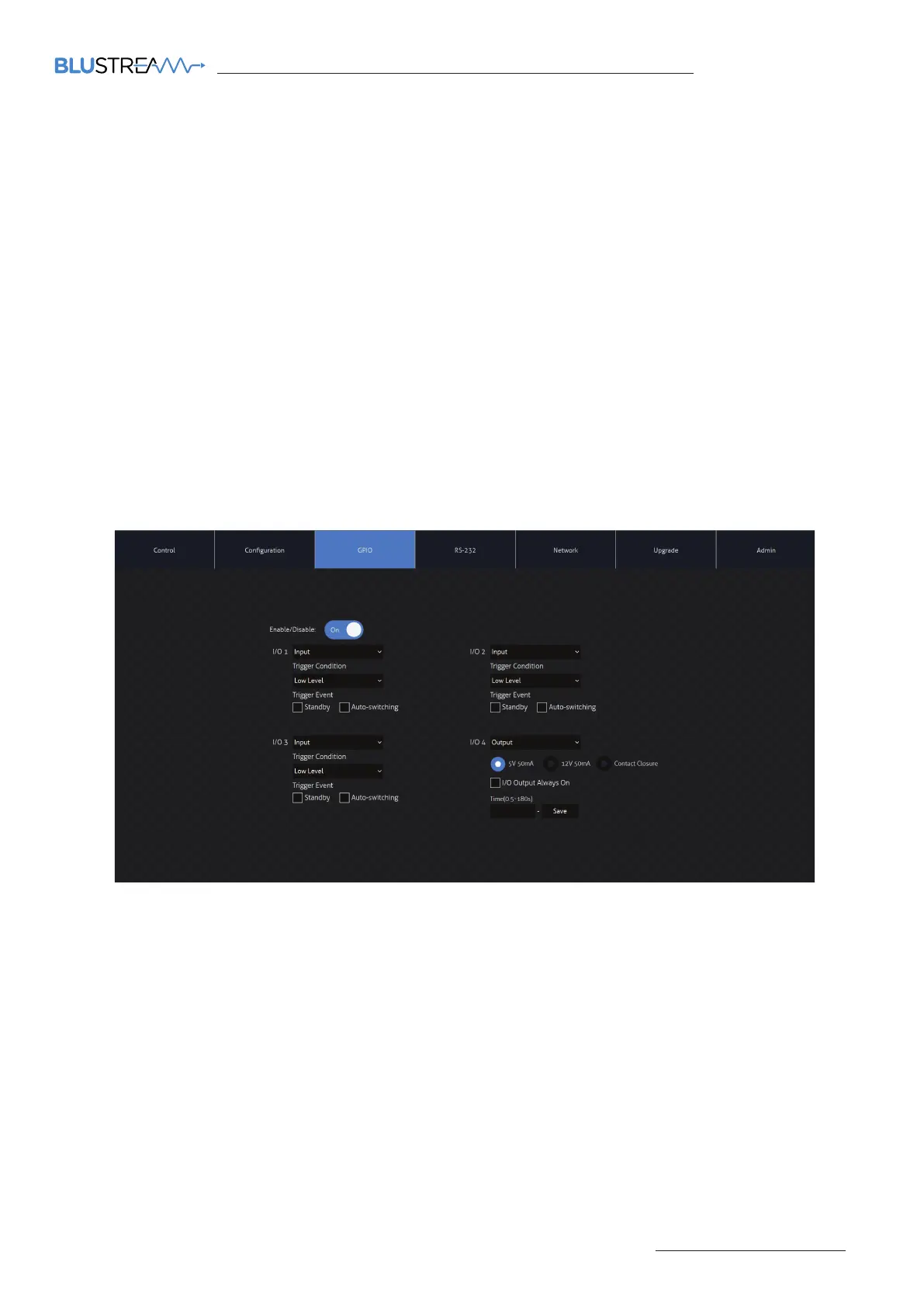 The GPIO (General Purpose Input / Output) page allows for the configuration of the functionality of the GPIO ports on
