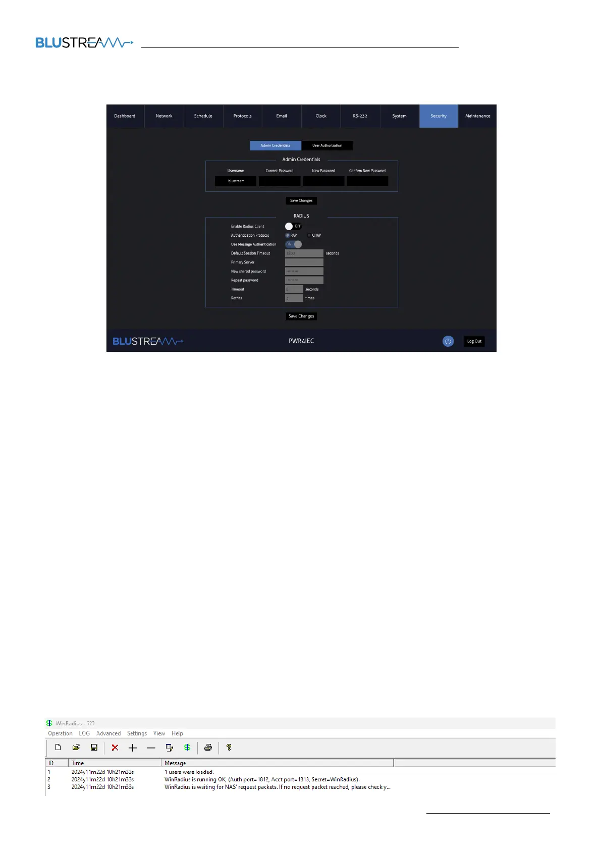 The Security page is split into two sub pages, toggled by the Admin Credentials or User Authorization tabs at the top of the page: