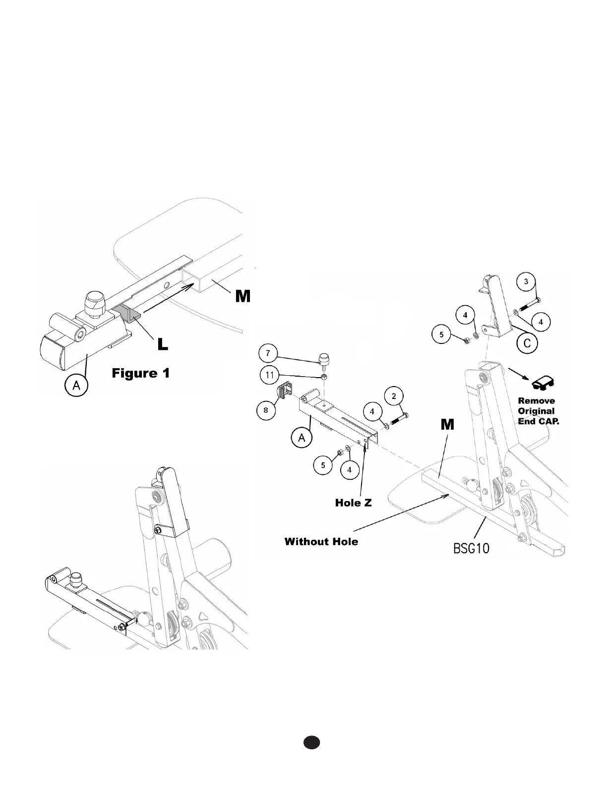 1. Slide the Main Lower Bracket (A) over the end of the BSG10 Foot Plate Bracket (M).