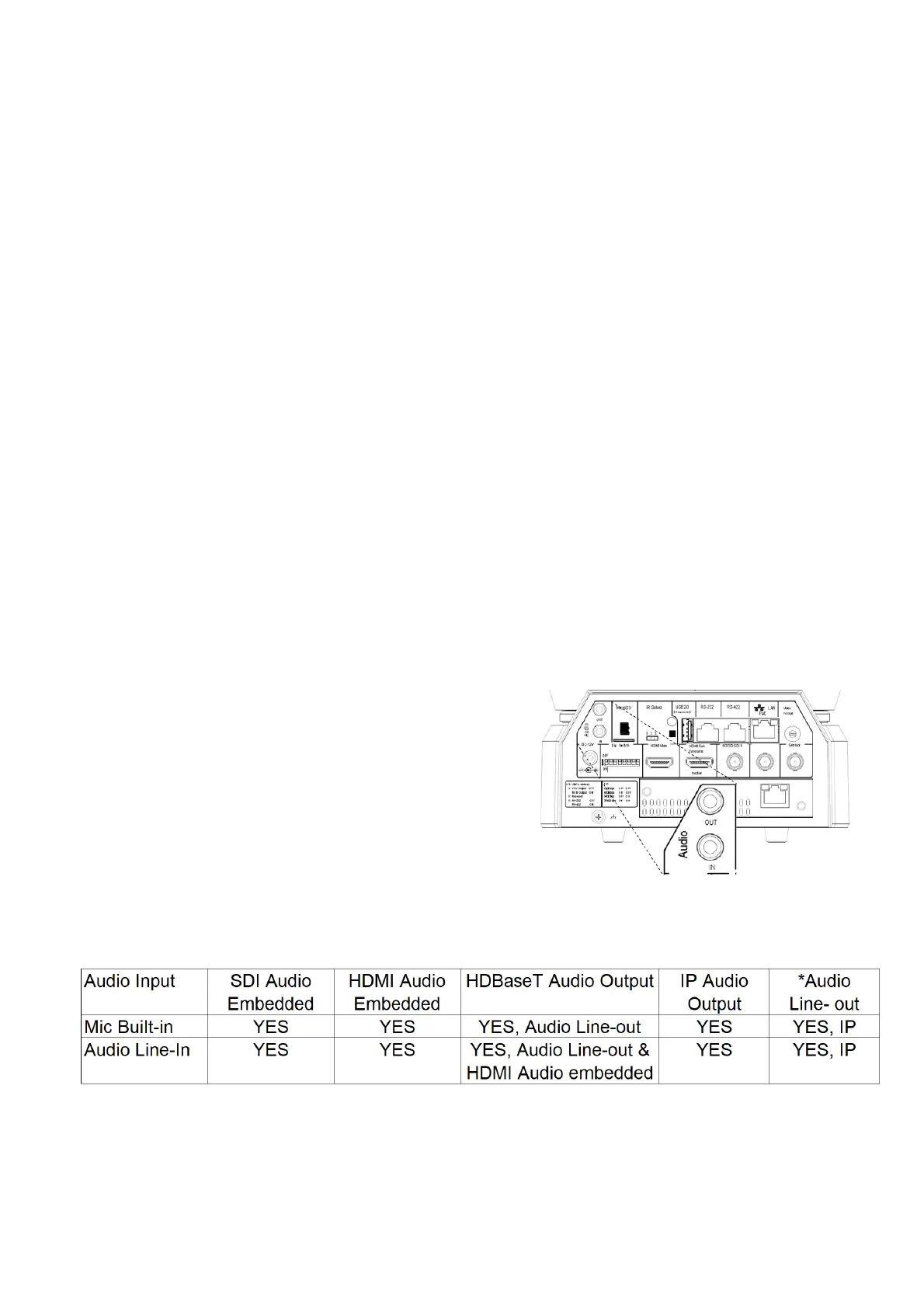 • Audio is embedded with Camera HDMI, SDI and IP video signal.