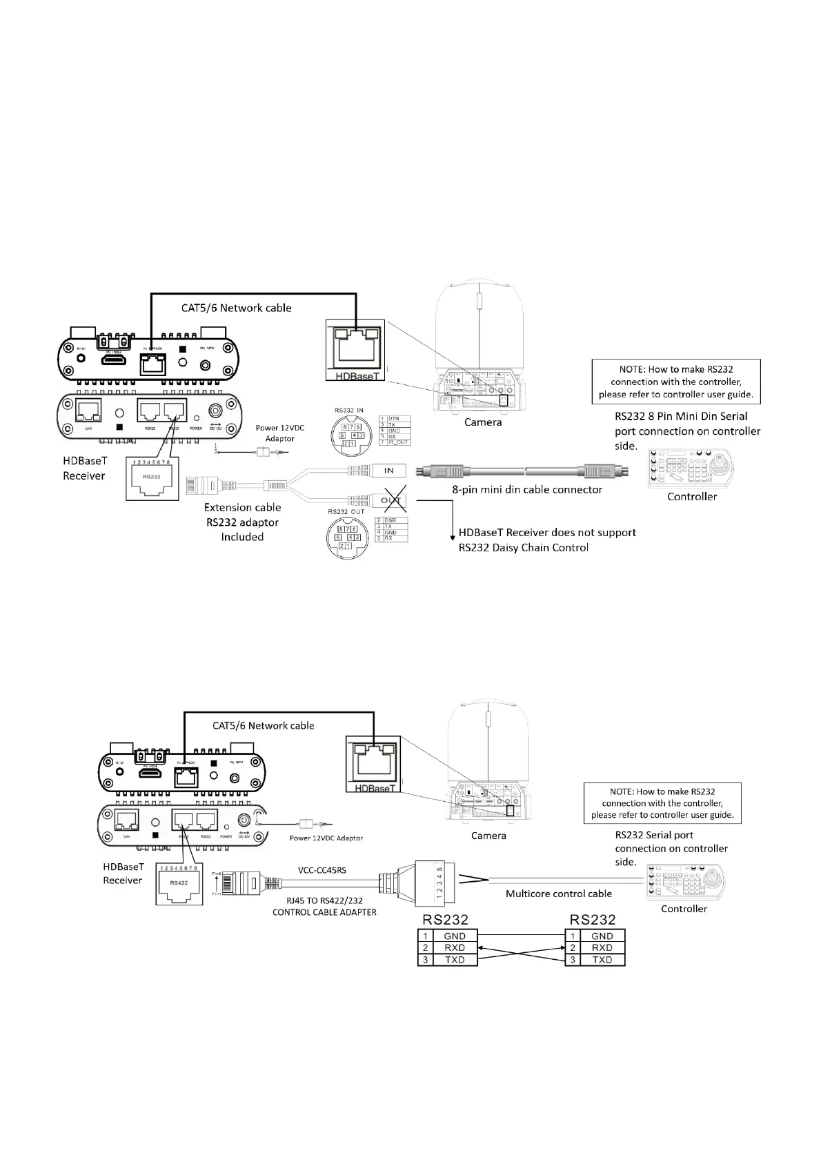 • HDBaseT does not support RS232 daisy chain control. So only plug in to “IN” 8-pin Mini Din port