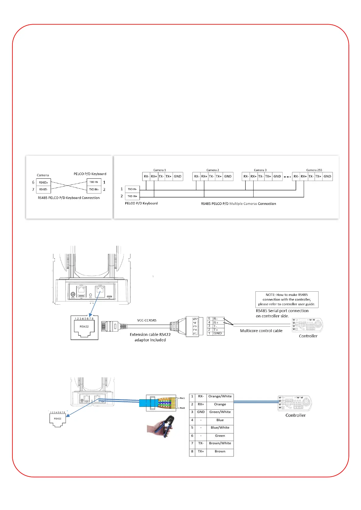 camera and the controller to make RS485 connection by following the pin definition below: